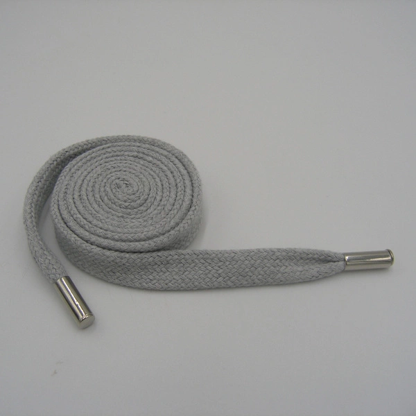 CT-40/14/130E - плоский хлопковый шнур для затяжки одежды с серебристыми металлическими наконечниками.